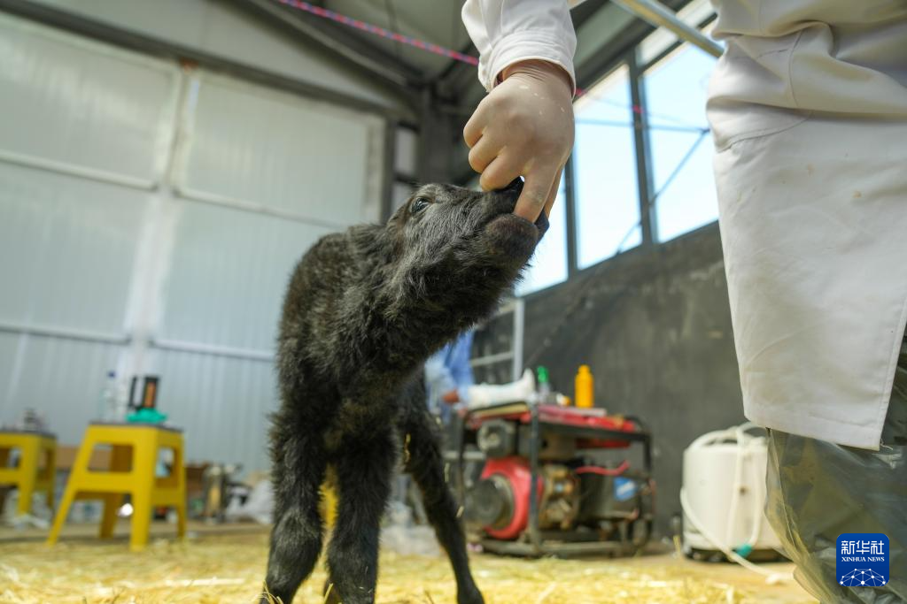 2025年7月11日,在西藏(当雄)金丝野牦牛繁育基地,工作人员检查克隆牦牛身体状况。7月10日中午12时40分,该基地剖腹诞生了第一头克隆牦牛,体重33.5公斤。这头新出生的克隆牛犊个头比正常新生牛犊较大,全身通黑,能够正常行走,身体状况良好。