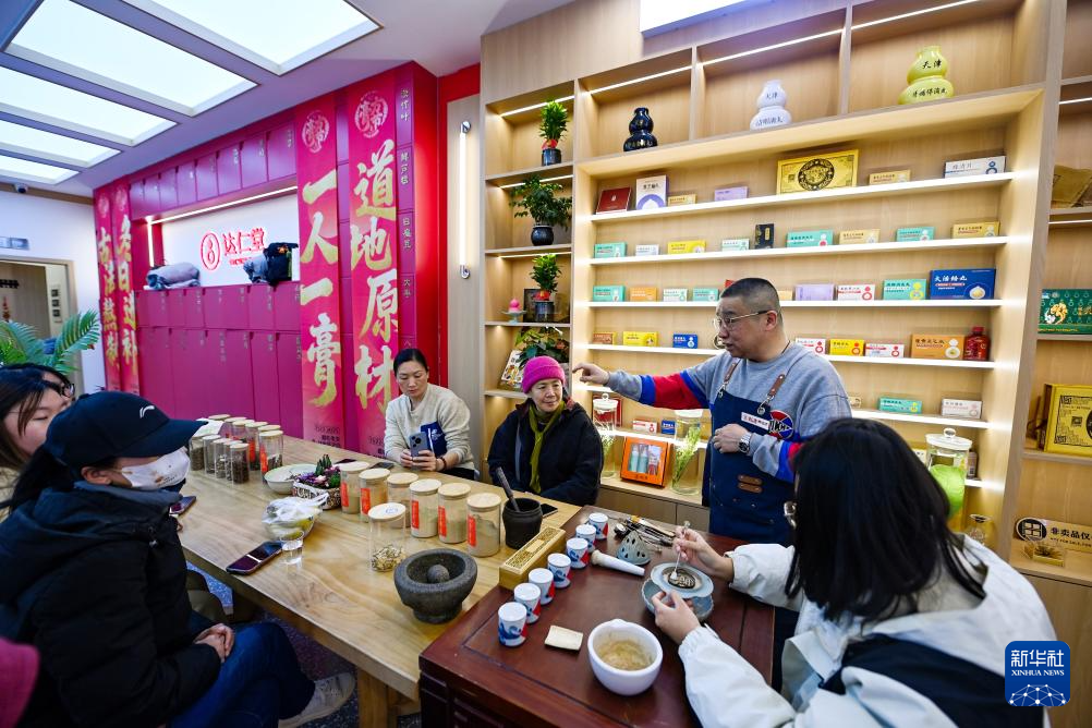 12月24日,在位于天津市河北区的达仁堂养生坊举办的非遗体验课上,工作人员在介绍养生知识。