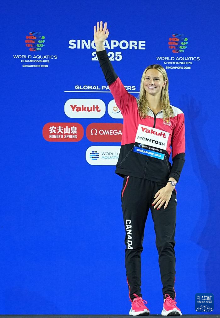 这是2025年7月31日,冠军加拿大选手麦金托什在2025年世界游泳锦标赛游泳女子200米蝶泳颁奖仪式上。