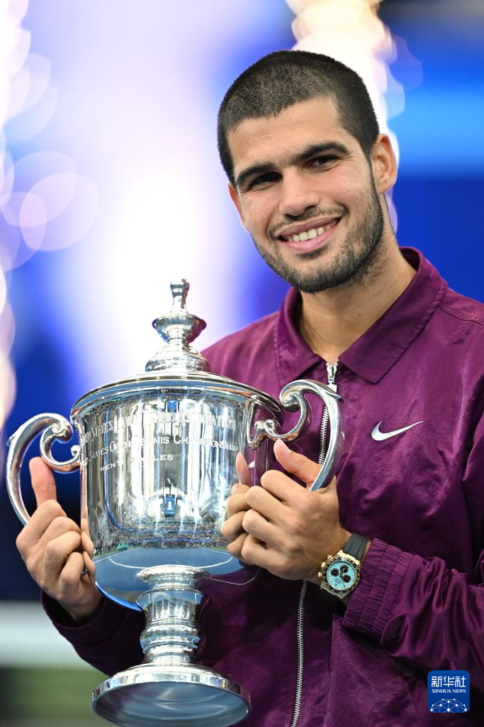 这是2025年9月7日,冠军西班牙选手阿尔卡拉斯在2025美国网球公开赛男子单打颁奖仪式上。