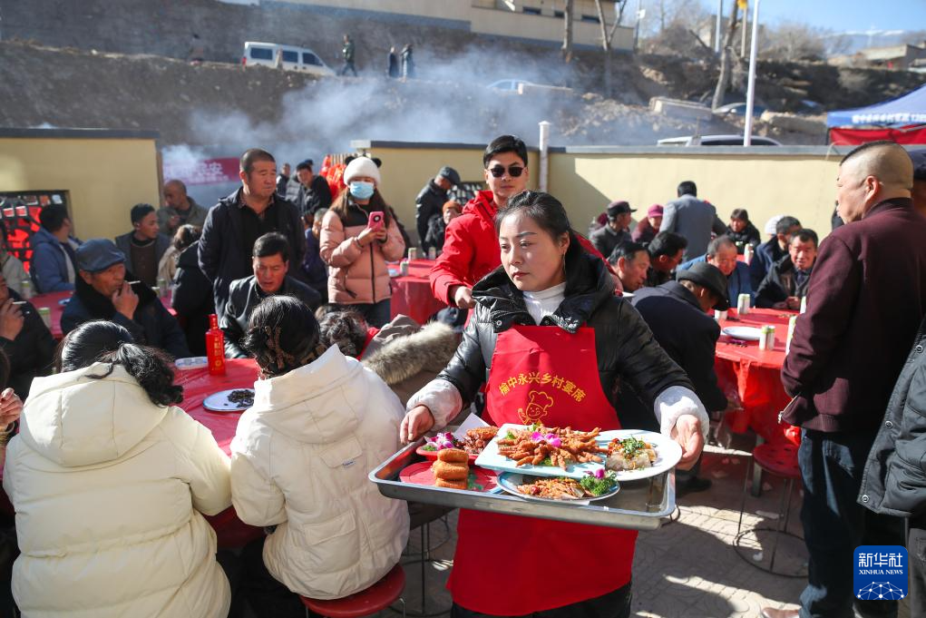 12月29日,帮厨人员在榆中县马坡乡马莲滩村集中安置点的乔迁宴上端菜。