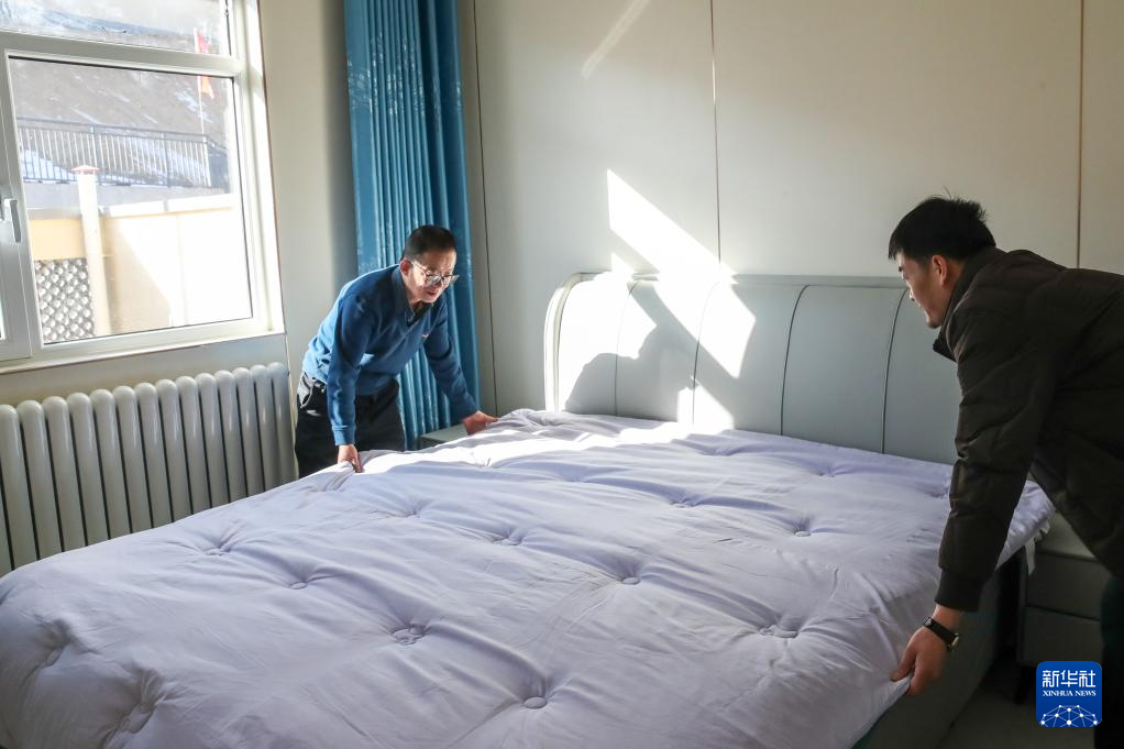 12月29日,村民张伦贤(右)在榆中县马坡乡马莲滩村集中安置点的新家里整理床铺。