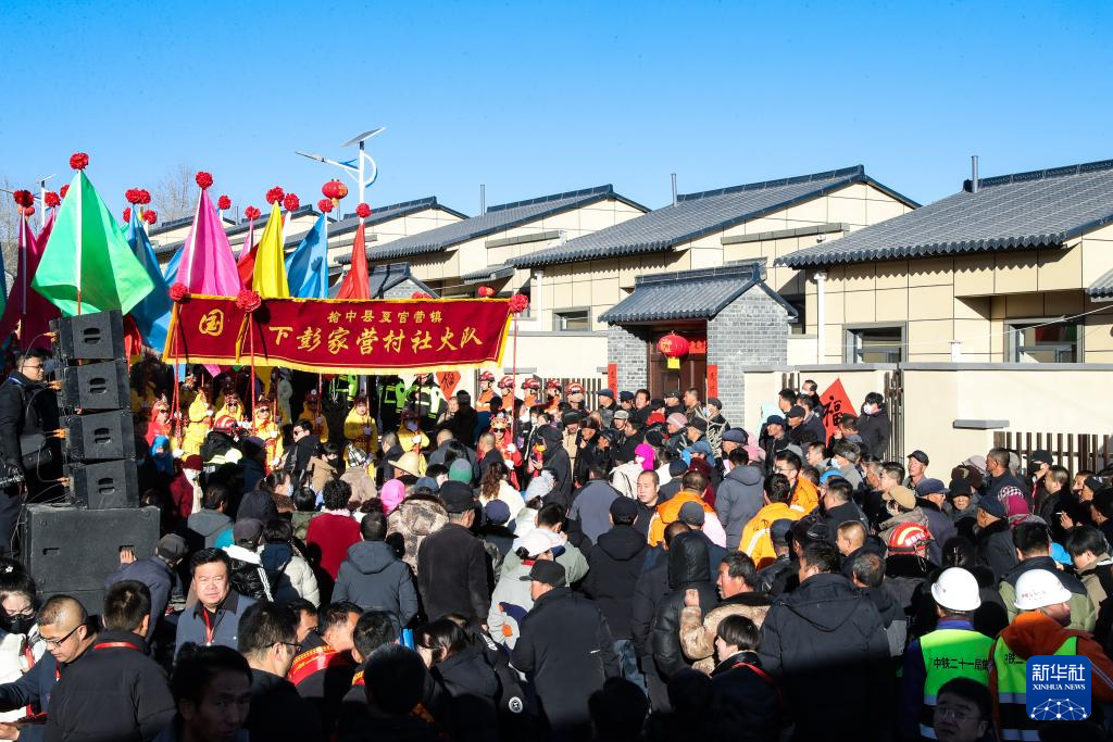 12月29日,社火队伍在榆中县马坡乡马莲滩村灾后重建集中搬迁入住活动现场表演。