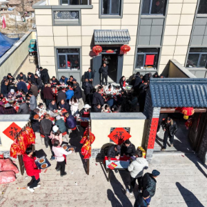 12月29日,村民在榆中县马坡乡马莲滩村集中安置点的新家里举办乔迁宴(无人机照片)。