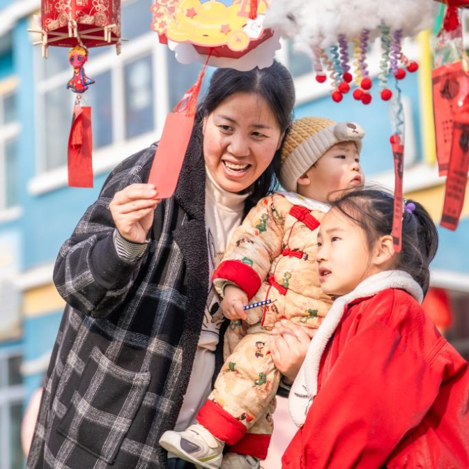 12月30日,在河南省驻马店市西平县一所幼儿园的元旦亲子游园庙会上,小朋友和家人一同参与猜灯谜游戏。