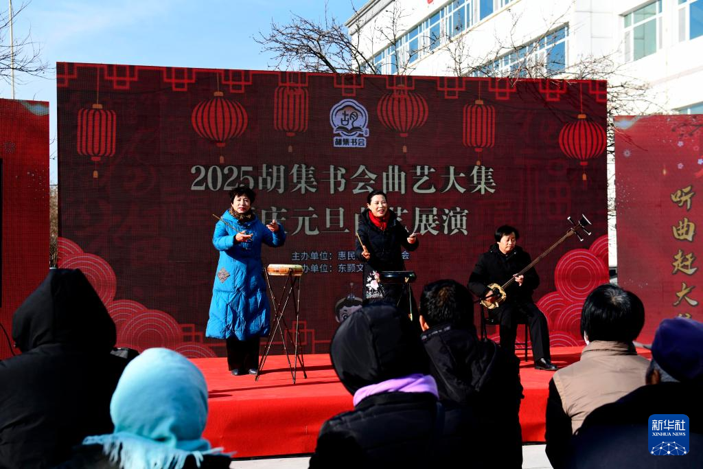 12月31日,在惠民县胡集镇,曲艺艺人在表演西河大鼓《莺鸽对》。