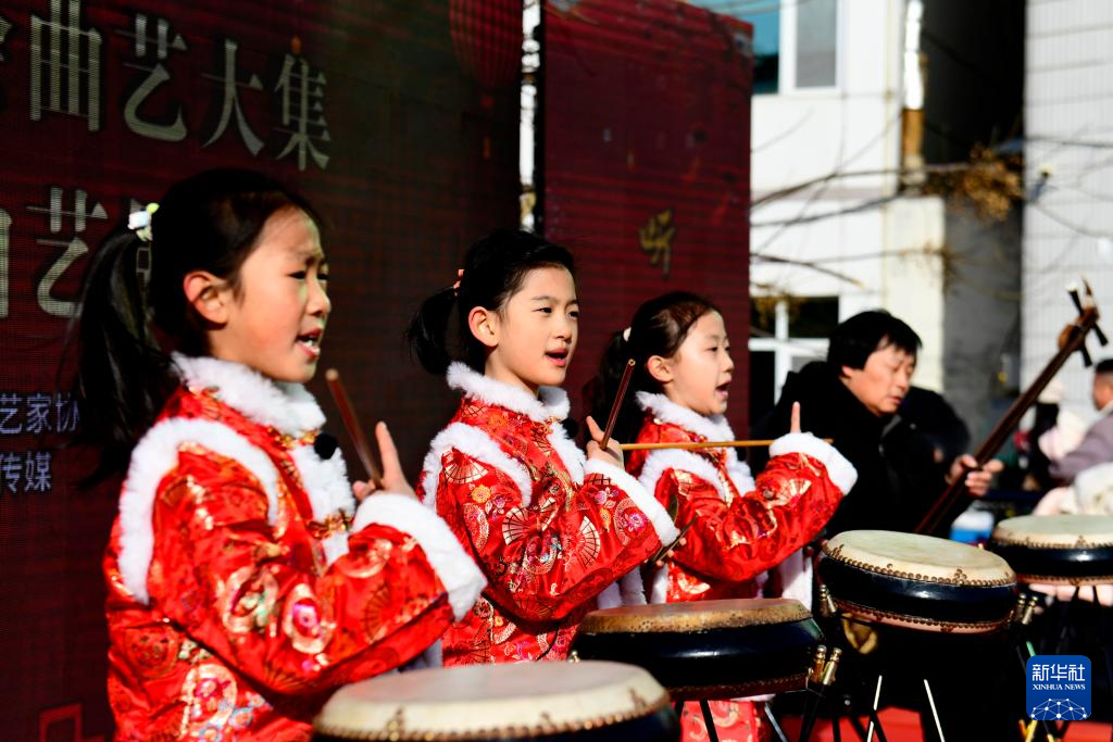 12月31日,在惠民县胡集镇,胡集镇中心小学学生在表演西河大鼓《勤俭节约》。