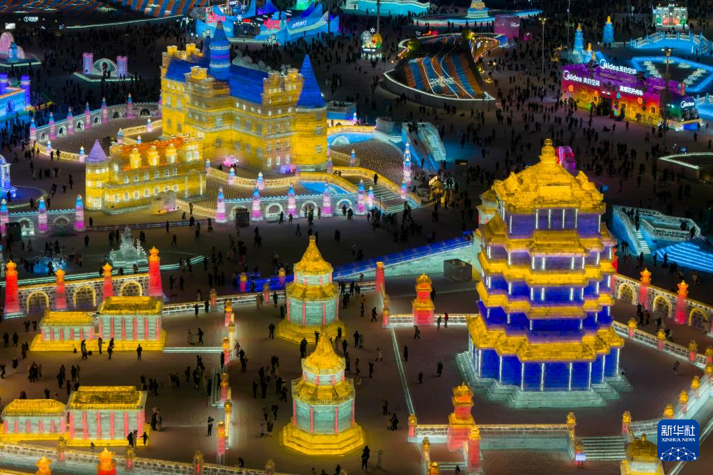 12月31日,游客在哈尔滨冰雪大世界园区游玩(无人机照片)。