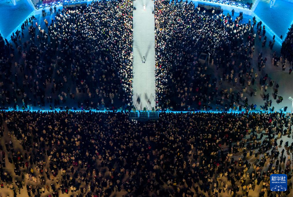 12月31日,众多游客在哈尔滨冰雪大世界园区游玩(无人机照片)。