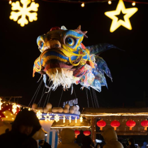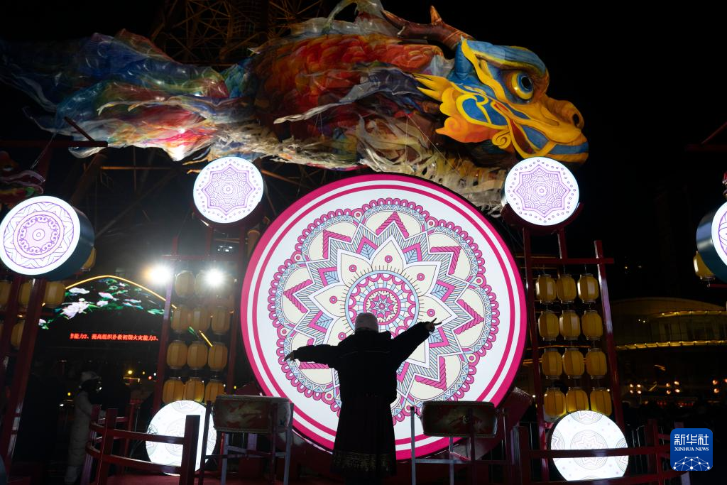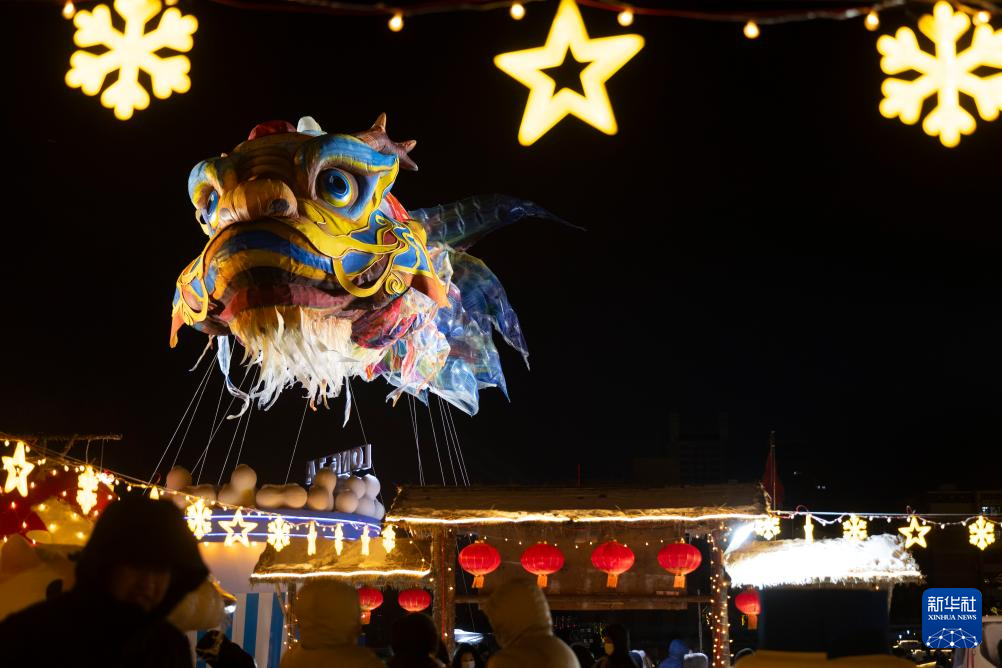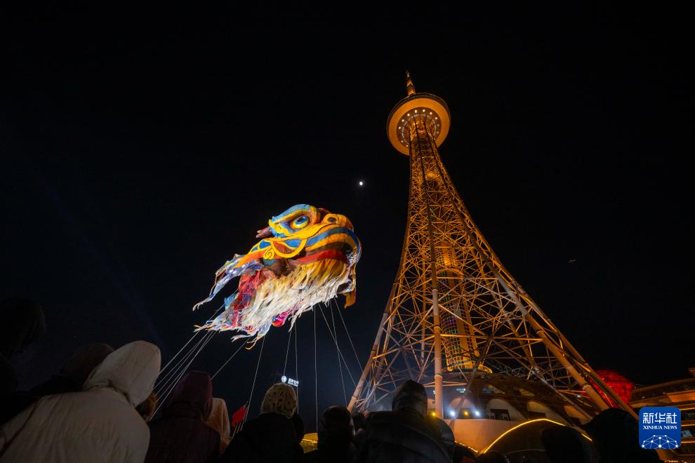 12月31日,30米长的巨型非遗鳌鱼灯亮相哈尔滨龙塔广场。