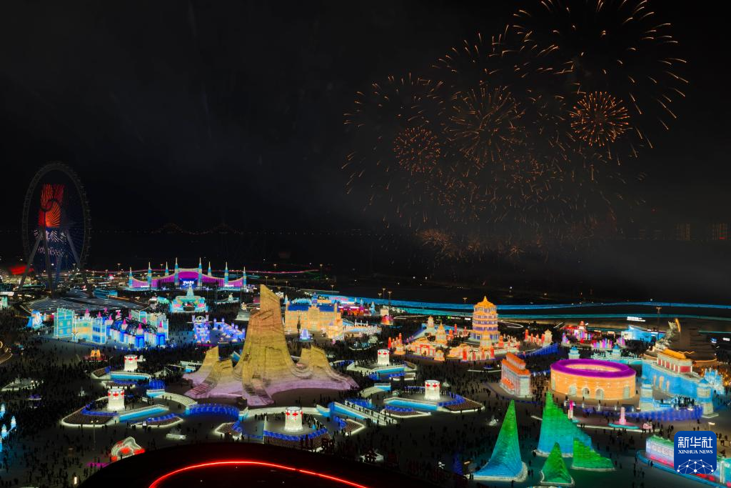 这是12月31日拍摄的哈尔滨冰雪大世界烟花秀(无人机照片)。