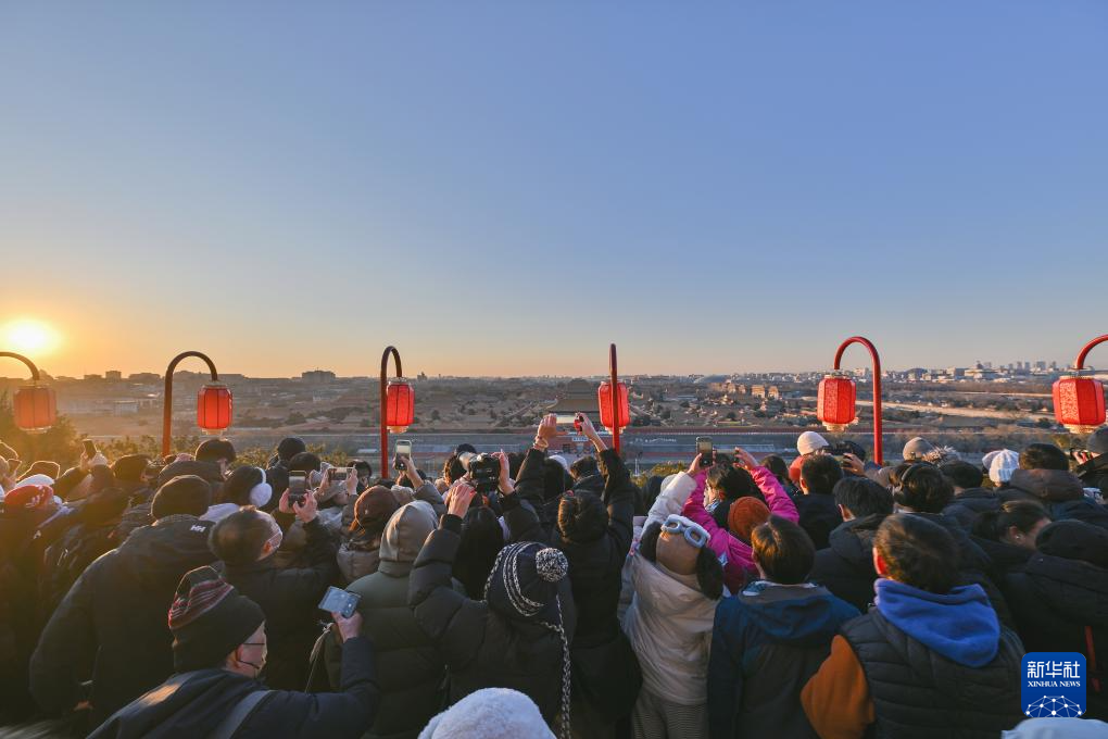 2026年1月1日,人们在北京景山上拍摄日出。