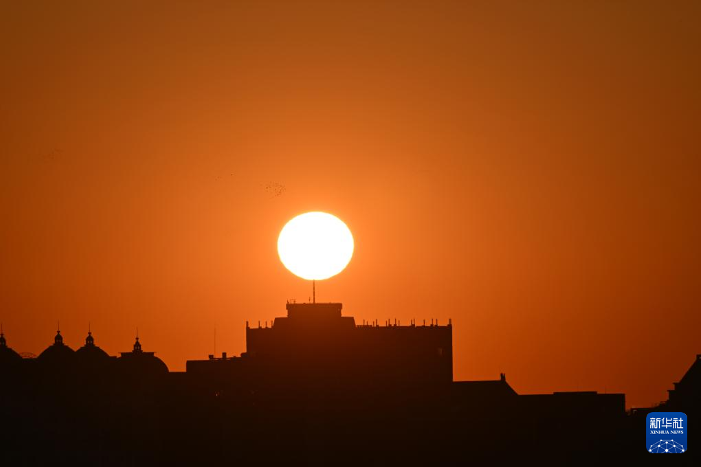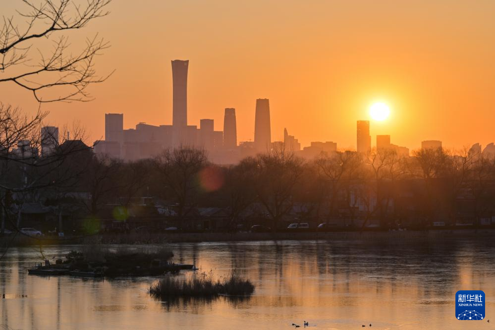 2026年1月1日在北京拍摄的城市建筑和初升的朝阳。