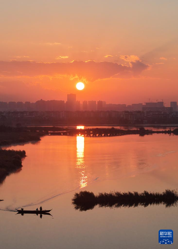 2026年1月1日在云南省昆明市干沟尾湿地公园拍摄的日出(无人机照片)。
