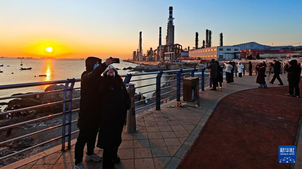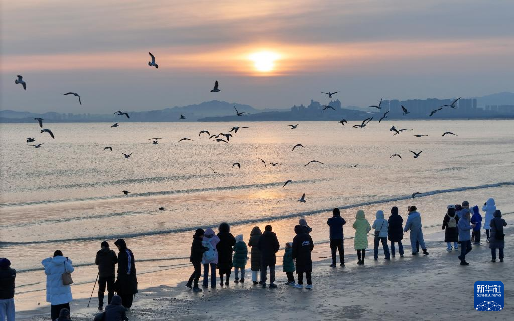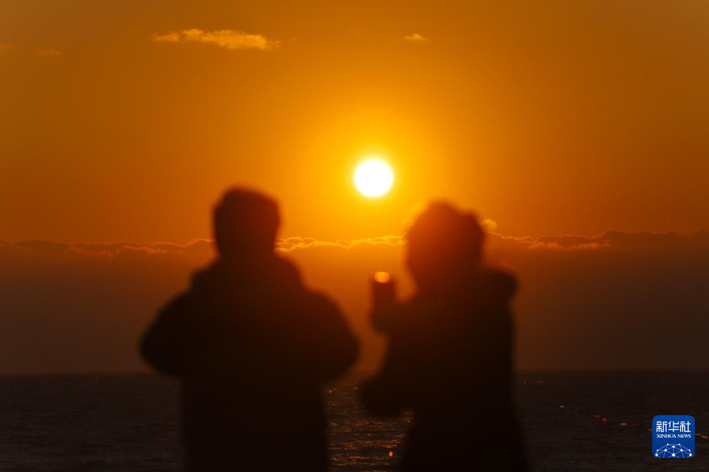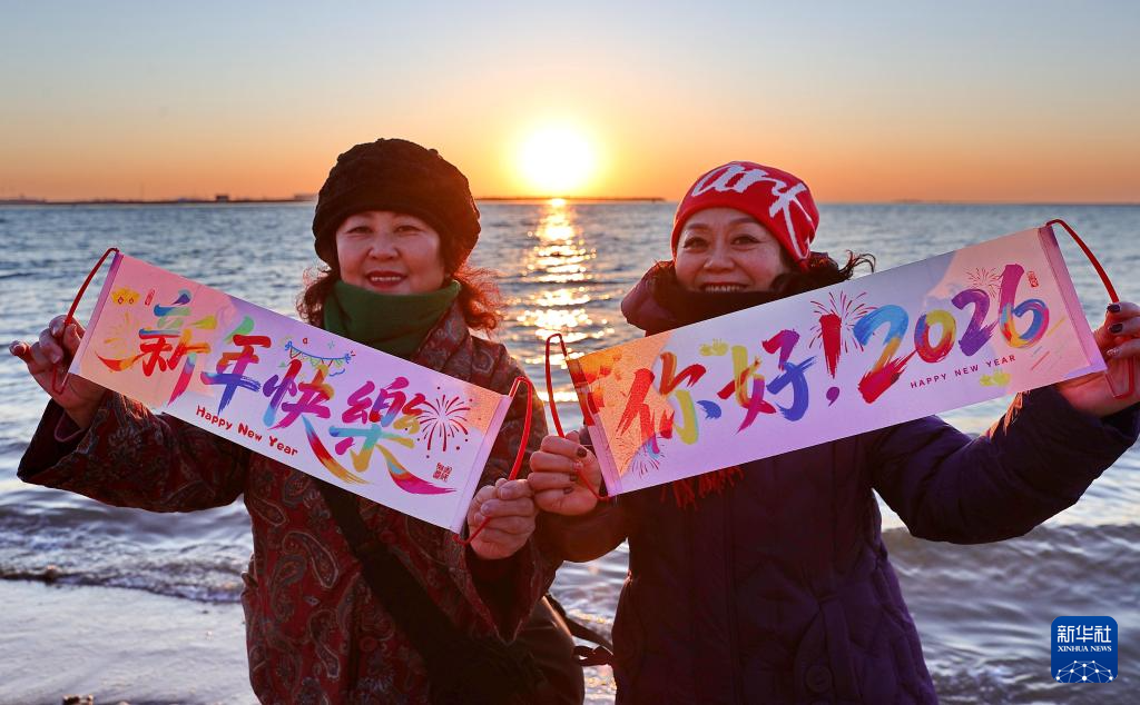 2026年1月1日,游客们在山东省威海市半月湾海水浴场迎接新年第一缕阳光。