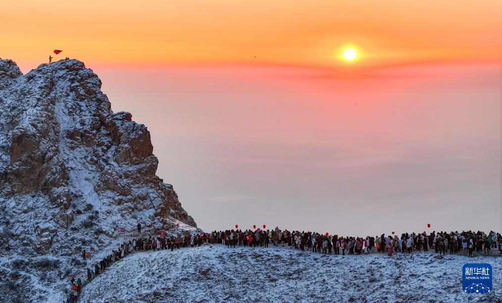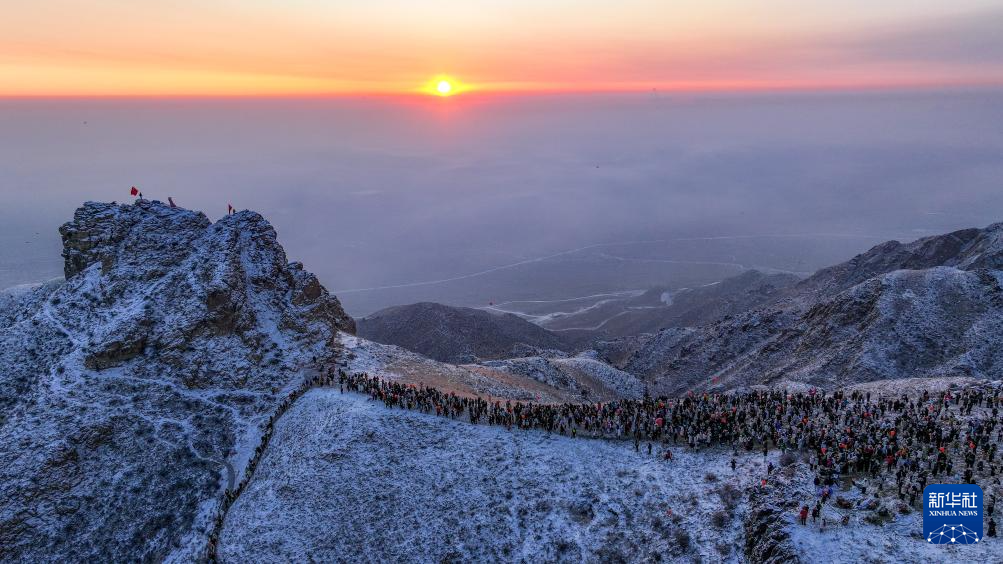 2026年1月1日,人们在宁夏银川市贺兰山滚钟口景区笔架峰观赏日出(无人机照片)。