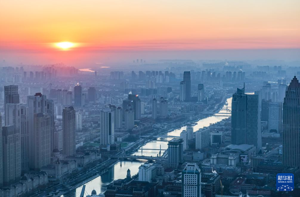 2026年1月1日在天津环球金融中心79层“天津之心”津塔观光厅拍摄的新年晨光下的天津城市景观。