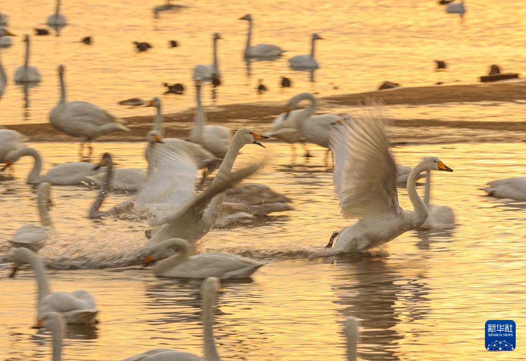 2026年1月1日,一群灰鹤迎着朝阳在河北省张家口市怀来县官厅水库国家湿地公园展翅飞舞。