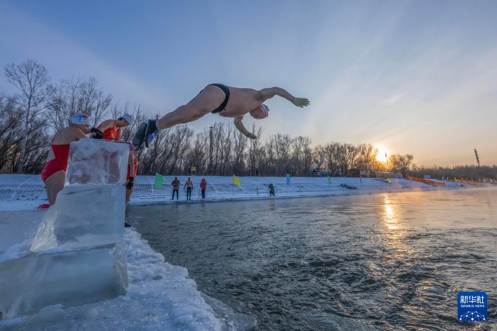 2026年1月1日清晨,冬泳爱好者在黑龙江省齐齐哈尔市嫩江冬泳基地冬泳。