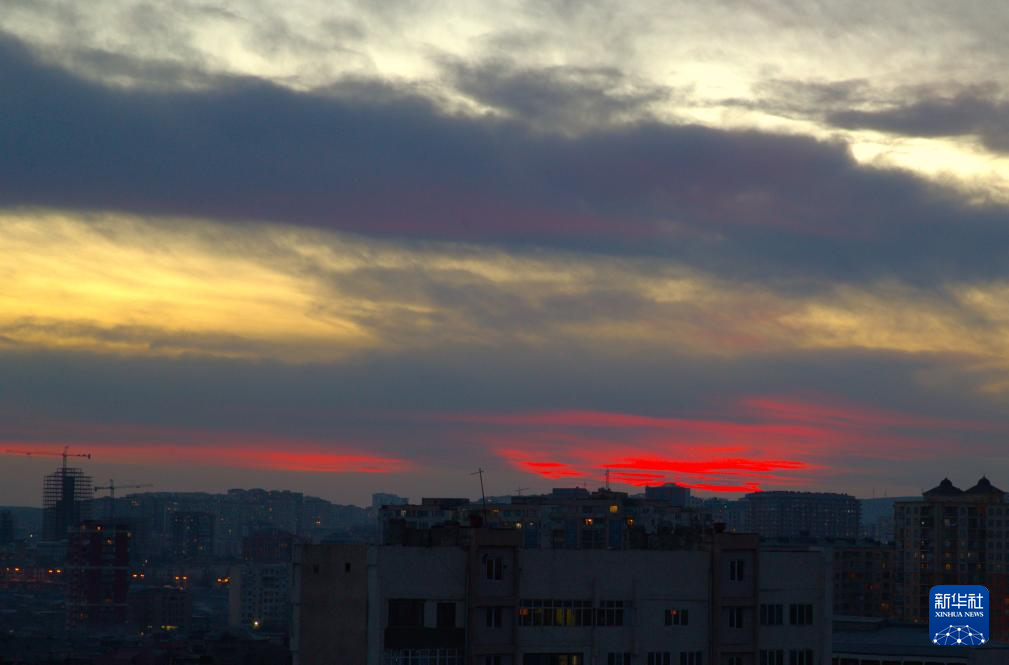 这是12月31日在阿塞拜疆首都巴库拍摄的2025年最后一缕落日余晖。