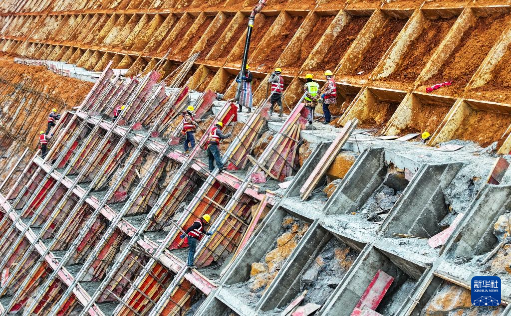 1月2日,在位于湖南省永州市新田县龙泉街道石甑源村的桂(东)新(田)高速建设工地,工人们进行防护坡施工作业(无人机照片)。