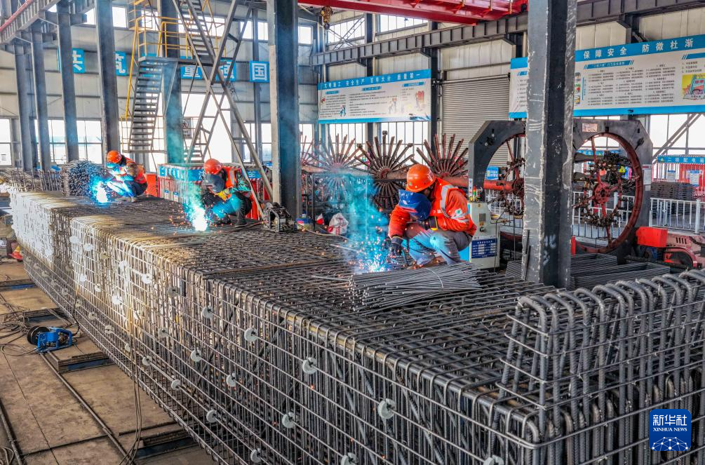 1月2日,工人在位于江苏省兴化经济开发区的中建七局宁盐高速泰州1标段钢筋加工场进行焊接作业(无人机照片)。