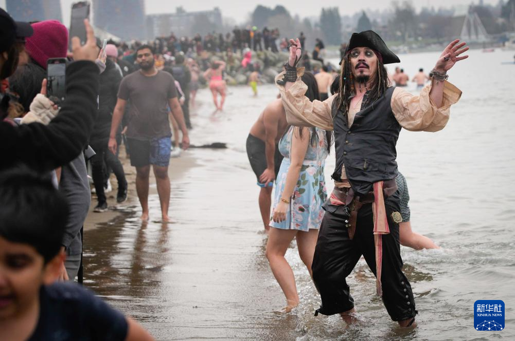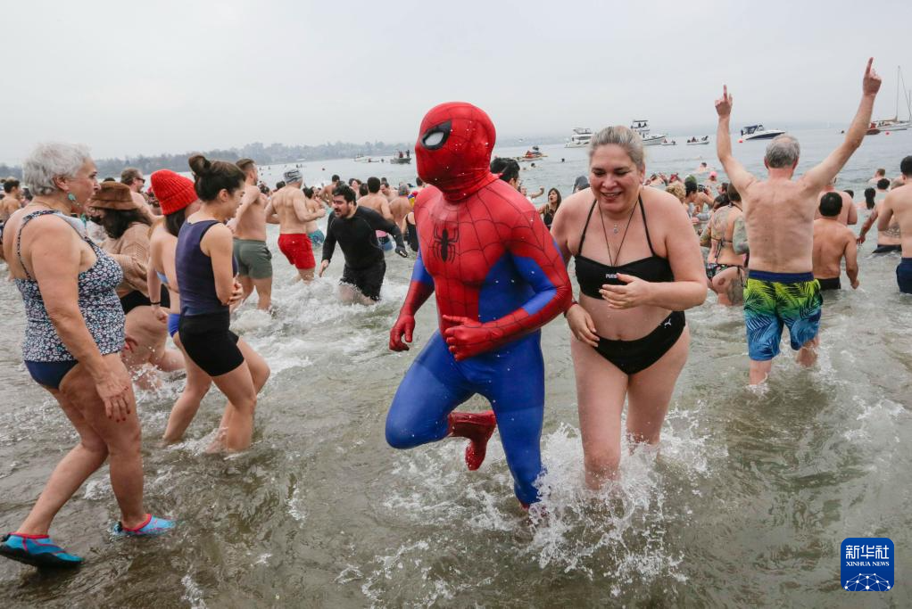 1月1日,人们在加拿大温哥华参加“北极熊冬泳”活动,迎接新一年到来。