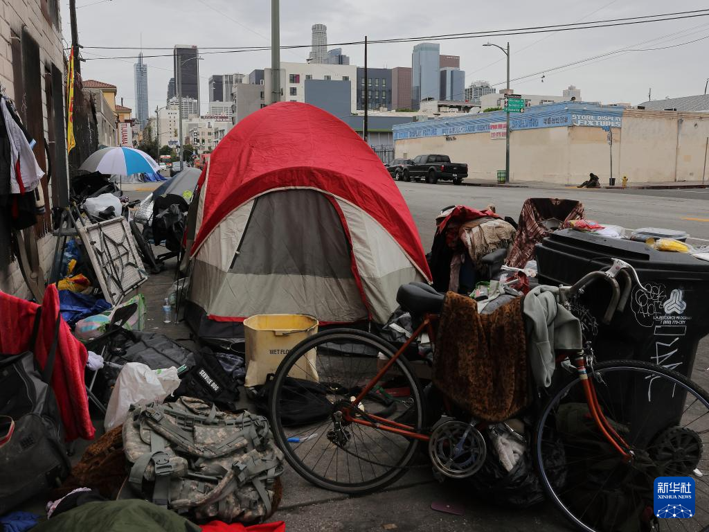 这是2025年12月31日在美国加利福尼亚州洛杉矶市中心拍摄的无家可归者的帐篷。