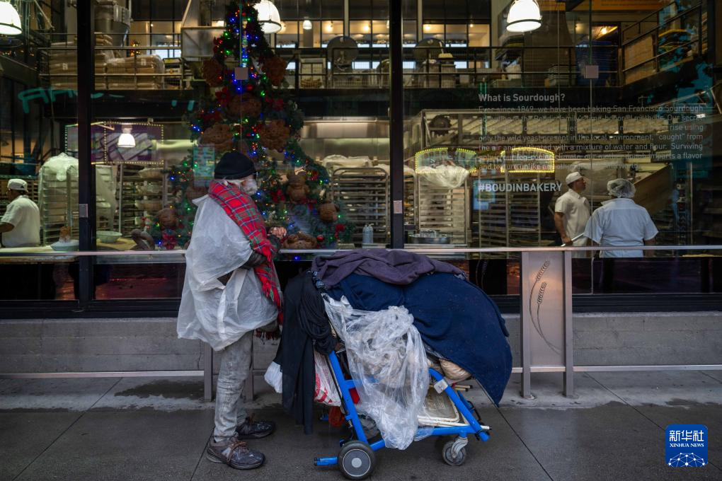 2025年12月31日,在美国加利福尼亚州旧金山,无家可归者从烘焙店外走过。