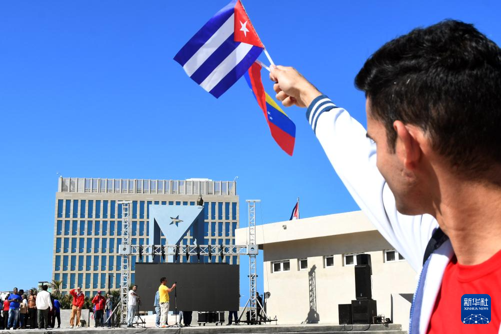 古巴各界民众3日在美国驻古巴大使馆前的反帝广场举行集会,强烈谴责美国对委内瑞拉发动军事入侵。