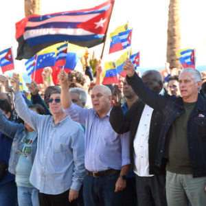 1月3日,在古巴首都哈瓦那,古共中央第一书记、古巴国家主席迪亚斯-卡内尔(前排右二)出席集会活动谴责美国军事入侵委内瑞拉。
