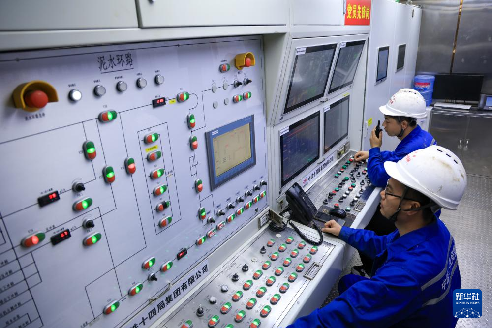 1月6日,中铁十四局施工人员在“深江1号”盾构机操作室控制设备运行。