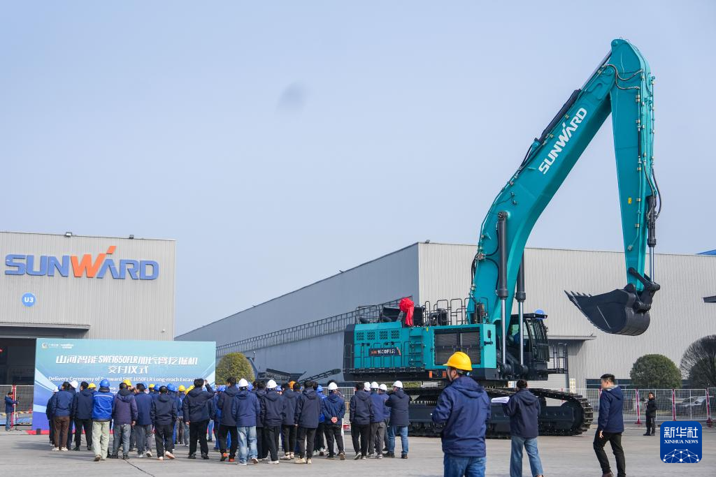 这是1月6日在长沙山河工业城拍摄的山河智能SWE1650FLR加长臂挖掘机(无人机照片)。