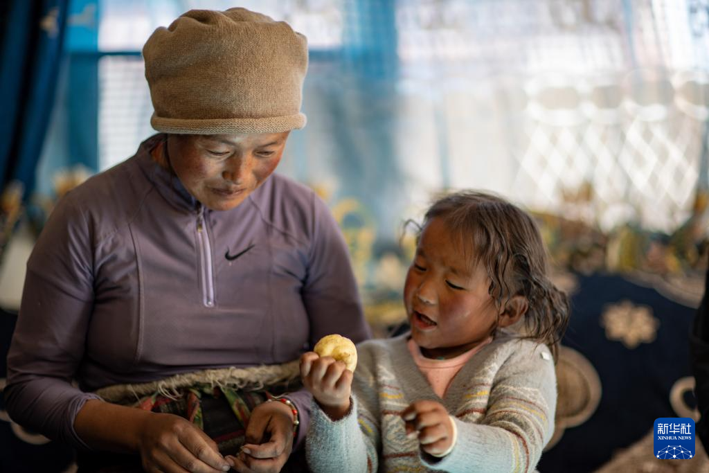 次仁拉姆(左)在新居中陪大女儿玩耍(1月5日摄)。