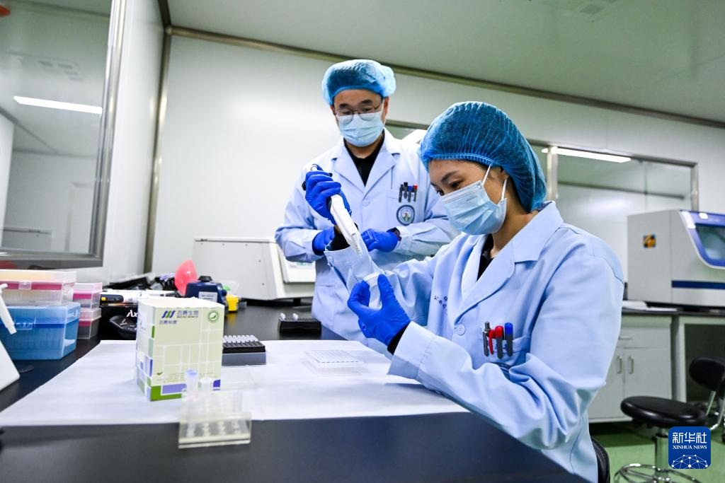 1月7日,锡林郭勒盟公安局刑侦支队刑事技术大队的许锐佳(左)、孙志敏在锡林郭勒盟公安局实验室进行血样检测。