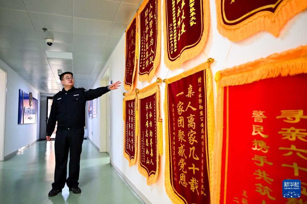 1月7日,锡林郭勒盟公安局刑侦支队刑事技术大队的许锐佳在锡林郭勒盟公安局介绍寻亲成功的“国家的孩子”赠送的锦旗。