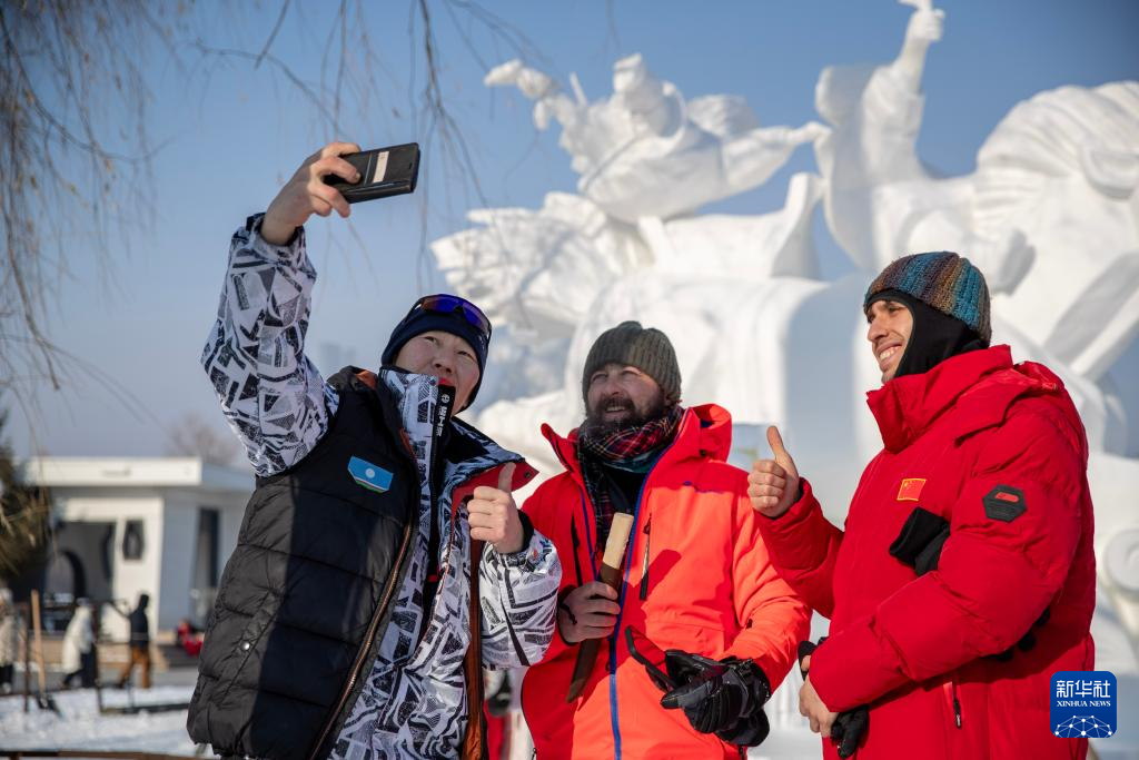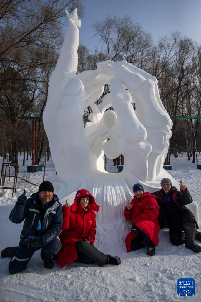 1月9日,各国艺术家在雪雕作品前合影留念。