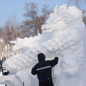 1月9日,俄罗斯阿穆尔斯克队参赛选手在进行雪雕作品《自由的幻象》收尾工作,作品最终获得最佳技巧奖。