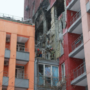 1月9日,乌克兰首都基辅市第聂伯区一栋公寓楼被无人机击中,救援人员正在拆除受损墙体。