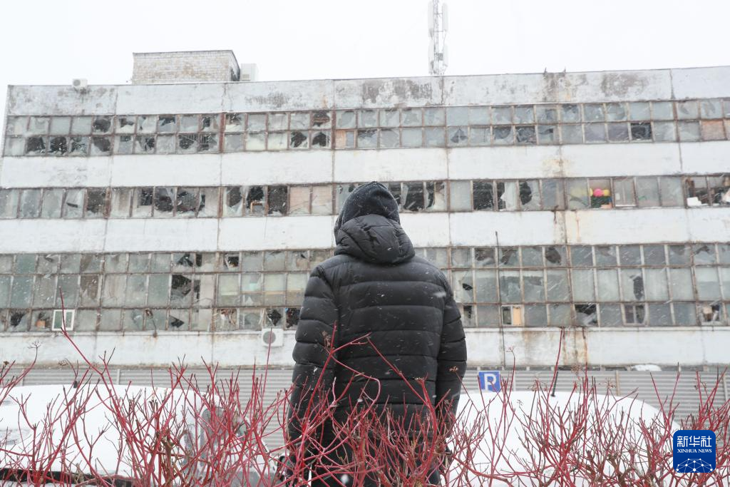 1月9日,一男子在乌克兰首都基辅市第聂伯区查看空袭中受损的建筑。