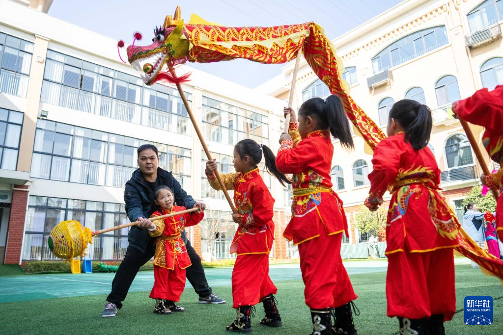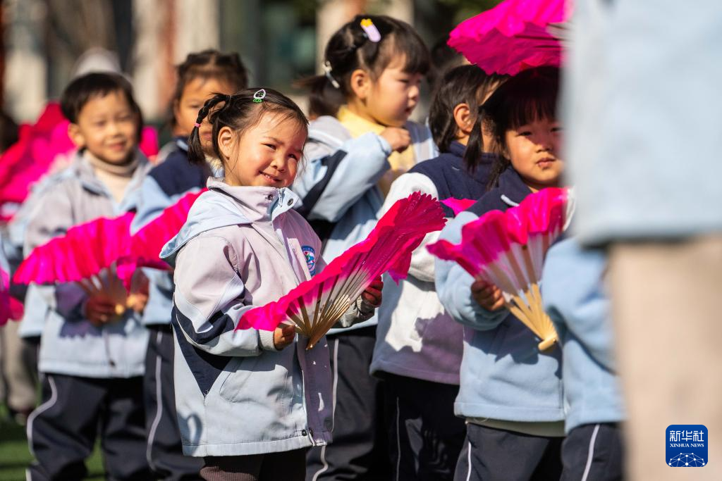 1月13日,在南县第三实验幼儿园,学生在课间练习南县地花鼓。