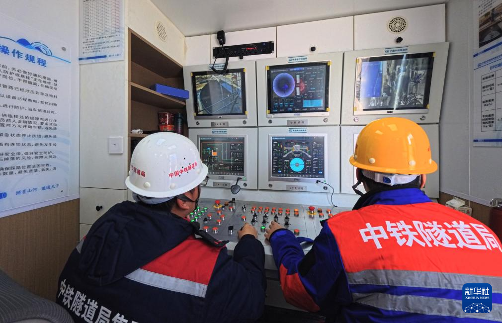 1月13日,技术人员在“启明号”竖井掘进机控制室内监测运行情况。