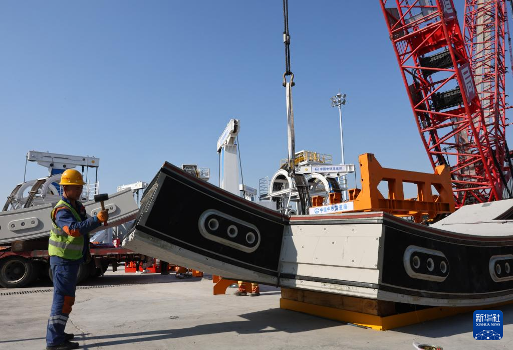 1月13日,在崇太长江隧道2号竖井项目施工现场,工人检查翼形管片上的传力垫片安装情况。