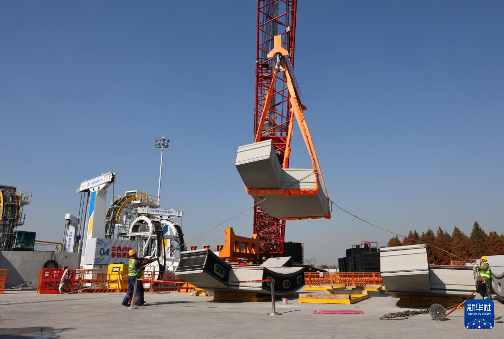 1月13日,在崇太长江隧道2号竖井项目施工现场,工人辅助吊机进行翼形管片吊装作业。