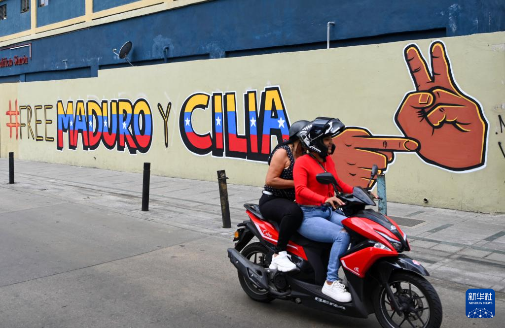 1月12日,在委内瑞拉首都加拉加斯,摩托车经过一面写有“释放马杜罗和西利娅(马杜罗夫人)”的涂鸦墙。