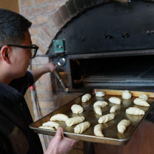 1月14日,面包师将面包胚送入石灰窑改造的面包窑炉。