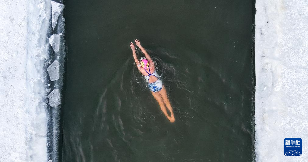 1月13日,在黑龙江省虎林市,冬泳爱好者在户外冬泳(无人机照片)。