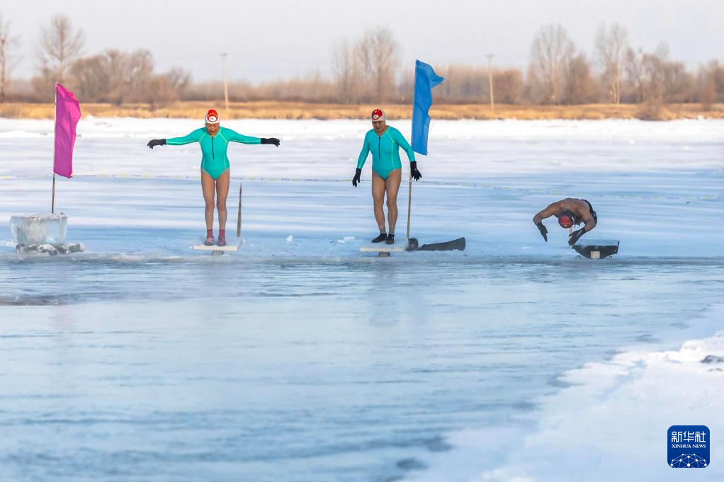 1月13日,在黑龙江省齐齐哈尔市,冬泳爱好者在户外冬泳。