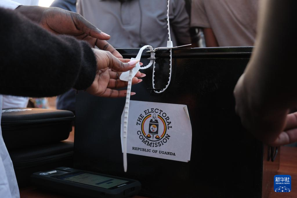 1月15日,在乌干达首都坎帕拉一处投票站,工作人员查看票箱密封条。