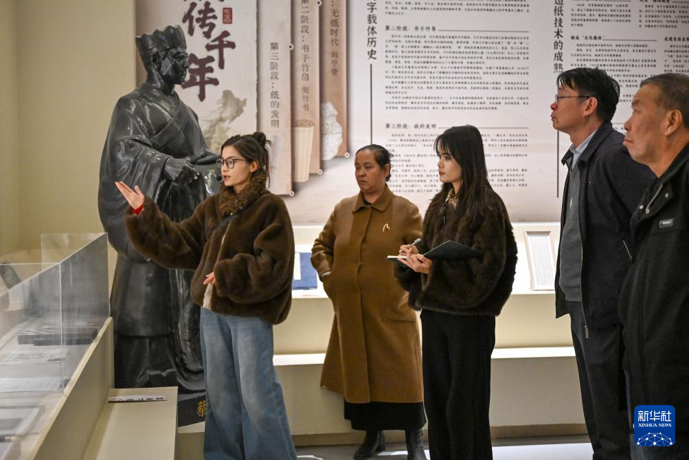 在新疆墨玉县桑皮纸产业园展示馆,穆耶赛尔·艾合麦提托合提(右三)和游客一起参观,并记录下讲解员的重点介绍(1月12日摄)。